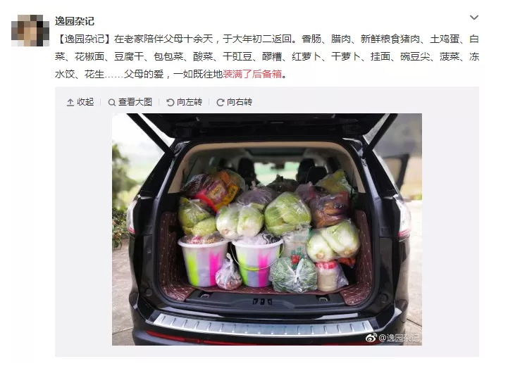 昨日,游子們從家這個港灣里,鳴笛啟航,奔向遠方。除了對鄉愁的百轉千回,更有親情的濃郁化不開。這幾天,網友們都在微博里曬圖,“媽媽給裝的后備箱”的話題,一時成了熱點——“親手做的馬蹄糕”“最愛的家鄉小柚柑”“一大罐子土榨花生油”“秋天腌的糖蒜”……后備箱被爸媽塞得滿滿的,不愿帶還不高興。于是乎,調皮的網友留言:“明年我開個貨車回來過年!”