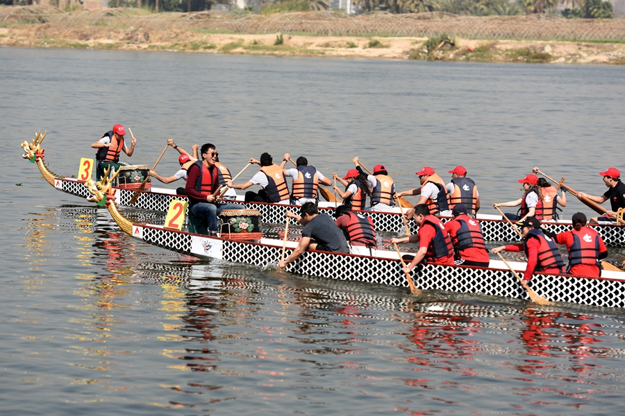 “歡樂春節”尼羅河龍舟大賽在埃及開羅尼羅河畔舉行。(圖片來源:新華社)