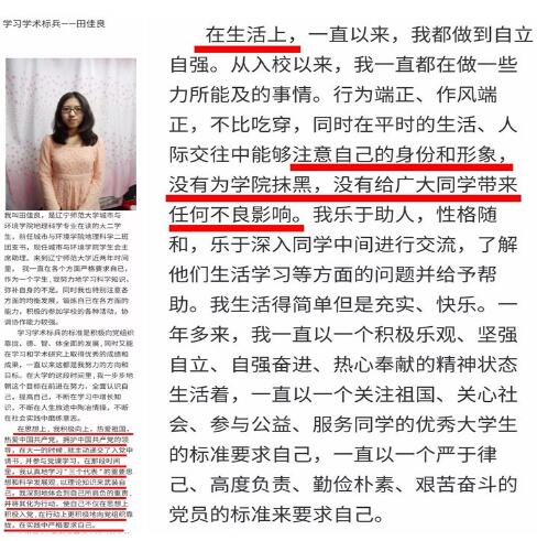 他們的所有行為都在向真正想要入黨卻因為學生工作經驗不足而被拒之門外的同學傳遞一種負能信號:如果破壞規則可以得到更多,為什么要遵守規則?如果顛倒黑白可以一帆風順,為什么還要選擇端正?學生黨員群體充斥著田佳良們這樣的投機分子,完全就是利己主義者的做派,沒有幾個是真正愿意為了黨奉獻自己。