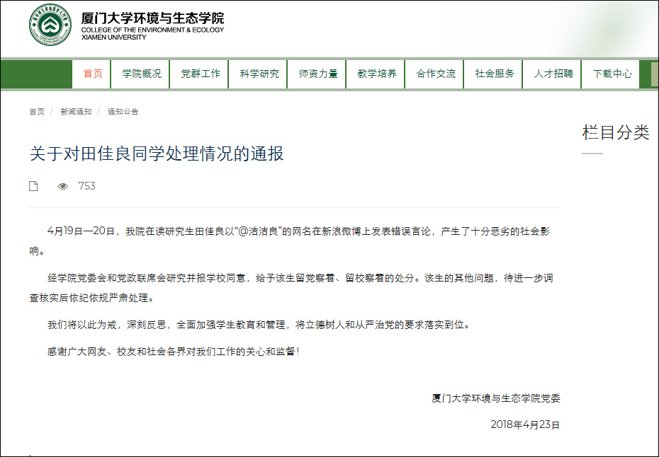 廈大最新通報出來了:給予發布辱華言論的田佳良留黨察看、留校察看處分。