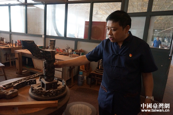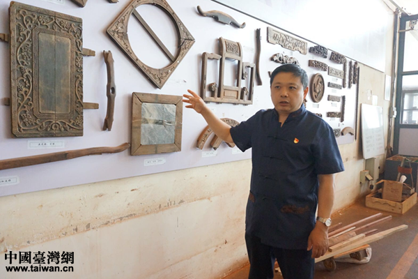 劉更生介紹“一木連做”的傳統(tǒng)工藝。(中國臺灣網(wǎng) 雍紫薇 攝)