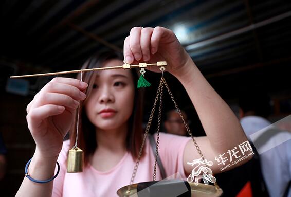一名網媒行的記者正在體驗當地傳統的手工制稱。記者 謝鵬 攝