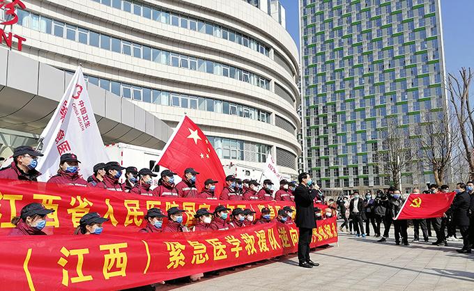 2月9日上午11時,在江西省人民醫(yī)院紅谷灘院區(qū)門前,9輛標(biāo)有國家緊急醫(yī)學(xué)救援隊(duì)字樣的專業(yè)救援車正整裝待發(fā)馳援武漢,嗡嗡作響的引擎聲伴隨著激昂壯闊的宣誓聲讓人感受到這次出征的意義非同尋常。