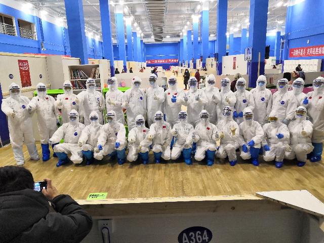 △國家(江西)緊急醫(yī)學(xué)救援隊(duì)隊(duì)員們在方艙醫(yī)院內(nèi)合影