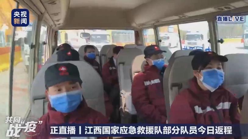 在江西國家應(yīng)急救援隊(duì)部分隊(duì)員返程的大巴車上