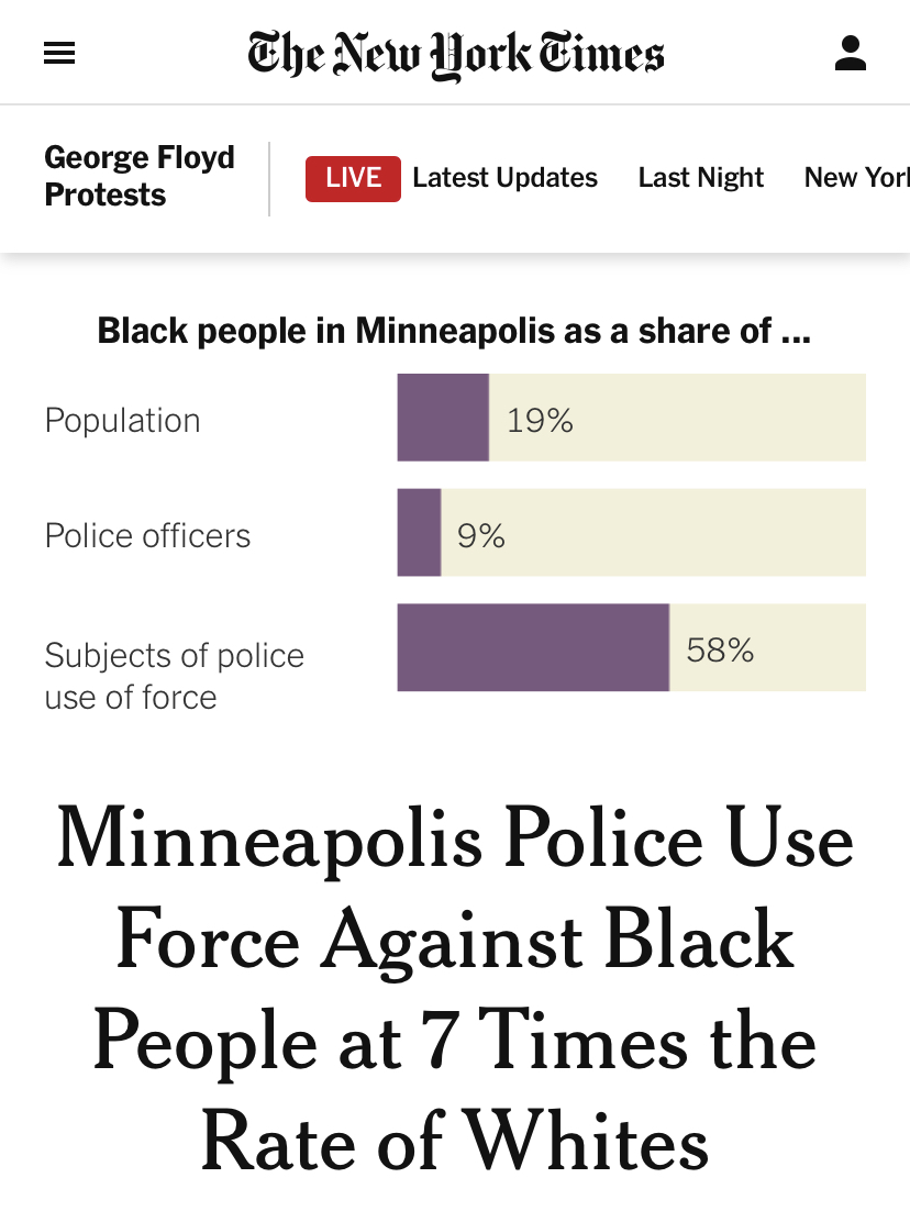據《紐約時報》報道,在非裔人口不到20%的明尼阿波利斯市,當地警方使用武力的對象60%均為非裔。2015年以來,明尼阿波利斯警方記錄了11500次警方使用武力案件,其中至少6650次的武力施加對象為非裔。與此相比,占明尼阿波利斯市總人口約60%的白人,只經歷了其中的2750次。