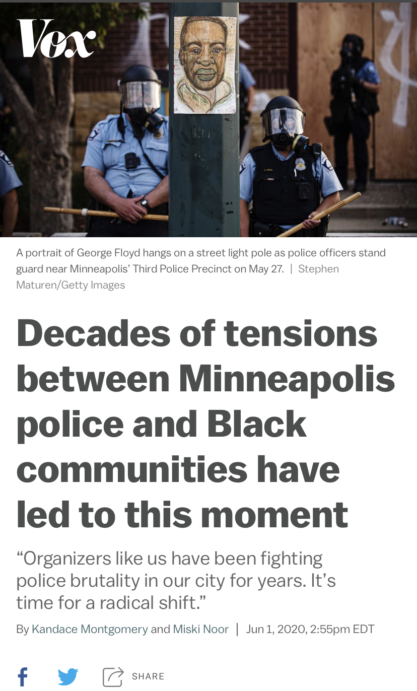 △Vox報道,多年來,明尼阿波利斯警方與非裔社區間的緊張關系導致了弗洛伊德慘劇的發生