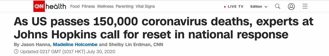 CNN在29日的報道中細數了美國病亡病例數字一路上升的歷程:2月29日,美國報告首個病亡病例;4月23日,病亡數達到5萬;5月27日,病亡病例突破10萬;7月29日,病亡數字突破15萬。