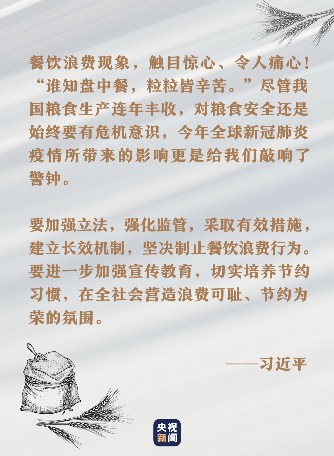 “誰知盤中餐,粒粒皆辛苦。”習近平一直高度重視糧食安全,提倡“厲行節約、反對浪費”的社會風尚,多次強調要制止餐飲浪費行為。