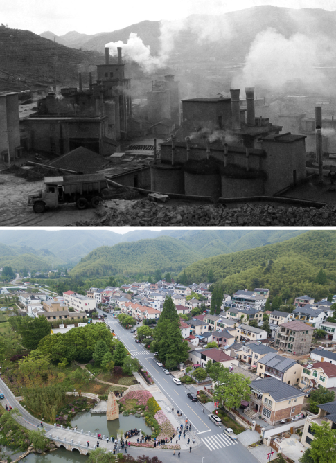 這是一張拼版照片,上圖為:浙江省湖州市安吉縣天荒坪鎮(zhèn)余村1980年代的資料照片;下圖為:2018年4月24日,游客在整修一新的余村游覽拍照(新華社記者翁忻旸攝)。