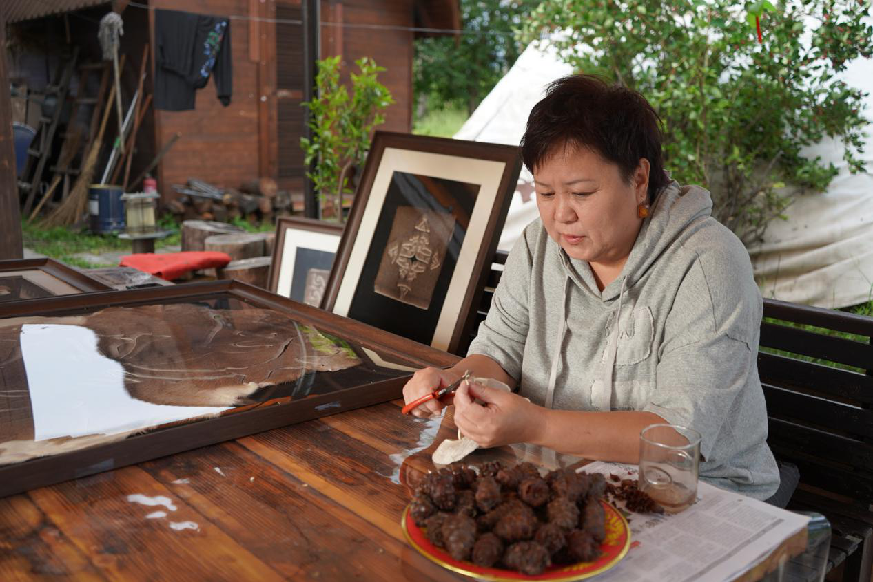 48歲的德柯麗是內(nèi)蒙古自治區(qū)級(jí)非遺傳承人,在她家院子里,一幅幅刻有鄂溫克族傳統(tǒng)圖案的馴鹿皮毛剪刻畫尤為引人注目。