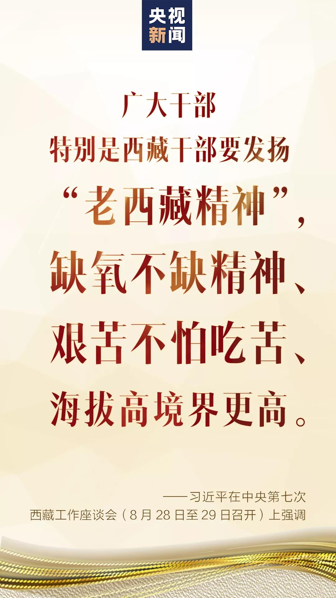 廣大干部特別是西藏干部要發揚“老西藏精神”,缺氧不缺精神、艱苦不怕吃苦、海拔高境界更高,在工作中不斷增強責任感、使命感,增強能力、錘煉作風;