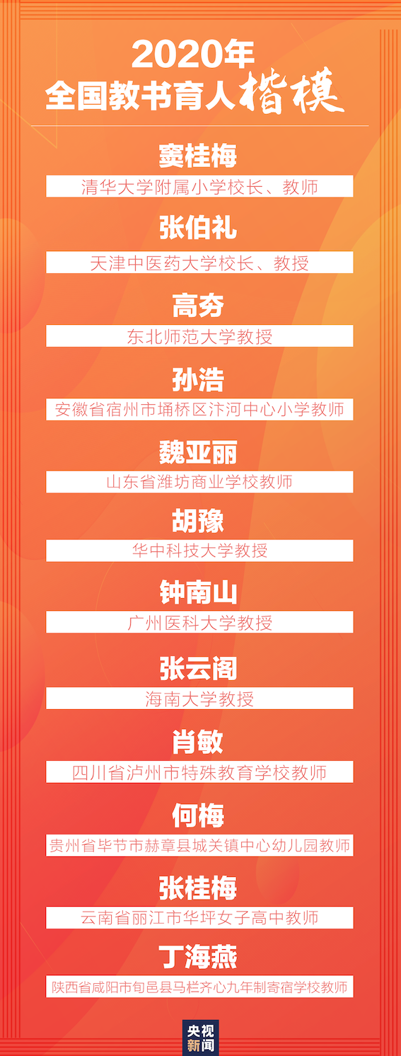 9月4日,2020年全國(guó)教書育人楷模名單發(fā)布,首次由中宣部和教育部聯(lián)合表彰,首次增加2個(gè)優(yōu)秀抗疫教師名額,共計(jì)推出12位“全國(guó)教書育人楷模”。