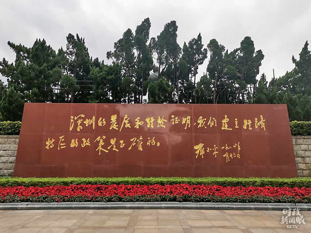△鄧小平銅像北側是一塊長達13米、高4.35米的花崗巖石墻,石墻北面鐫刻著鄧小平同志1984年視察深圳時的題詞:“深圳的發展和經驗證明,我們建立經濟特區的政策是正確的。”(總臺央視記者王冰拍攝)