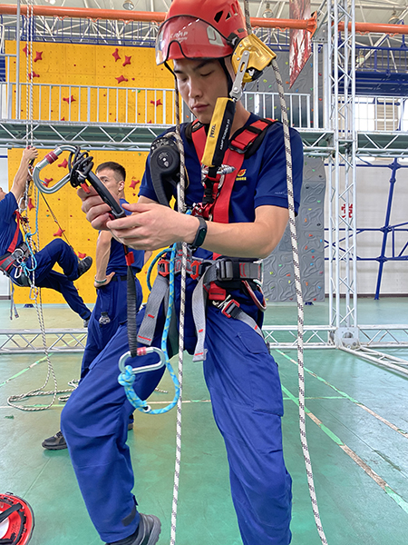 8月14日王鵬(左一)參加繩索救援訓練時的場景