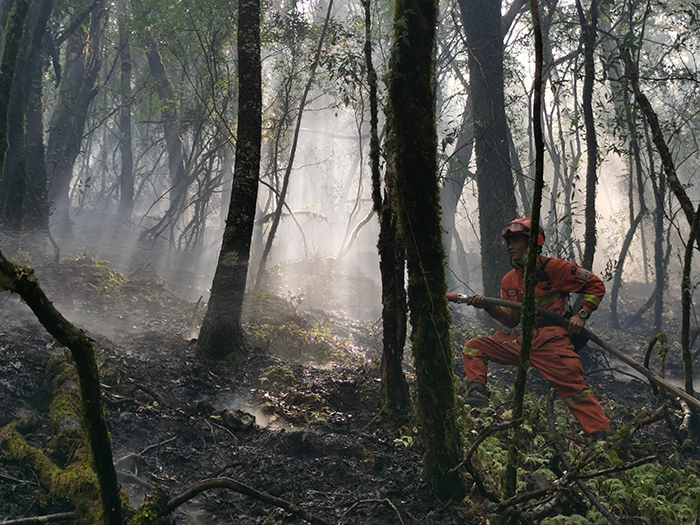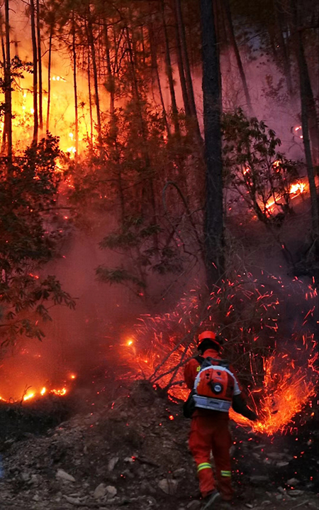 2019年3月,在涼山木里火場,王鵬和戰(zhàn)友連續(xù)奮戰(zhàn)10余天,成功將大火撲滅。王鵬身背滅火機撲打明火。