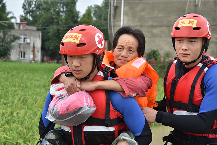 8月17日,四川省成都市金堂縣發(fā)生洪澇災(zāi)害,部分村莊房屋被洪水淹沒。王鵬(右一)和戰(zhàn)友乘坐橡皮艇挨家挨戶搜尋轉(zhuǎn)移被困群眾。王鵬和戰(zhàn)友轉(zhuǎn)移行動不便的高齡老人。