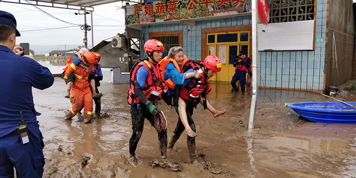 8月19日,王鵬(右一)在四川省樂山市金粟鎮(zhèn)參加搶險救援,連續(xù)在水中浸泡了10余個小時,背著群眾在泥濘中前行,成功將孤島中的群眾轉(zhuǎn)移至安全區(qū)域。