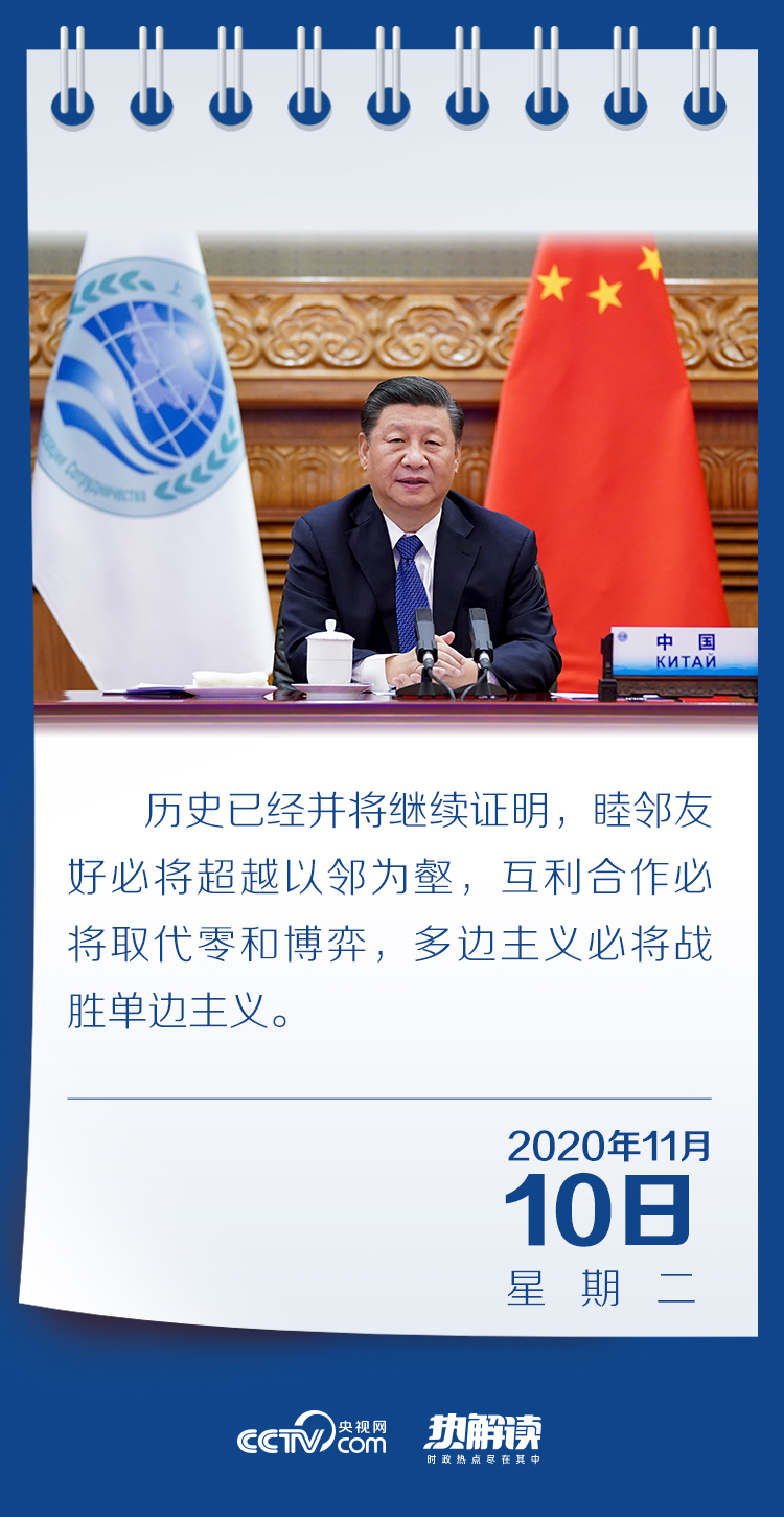 11月10日晚,習(xí)近平主席以視頻方式出席上海合作組織成員國元首理事會第二十次會議,并發(fā)表題為《弘揚(yáng)“上海精神” 深化團(tuán)結(jié)協(xié)作 構(gòu)建更加緊密的命運(yùn)共同體》的重要講話。