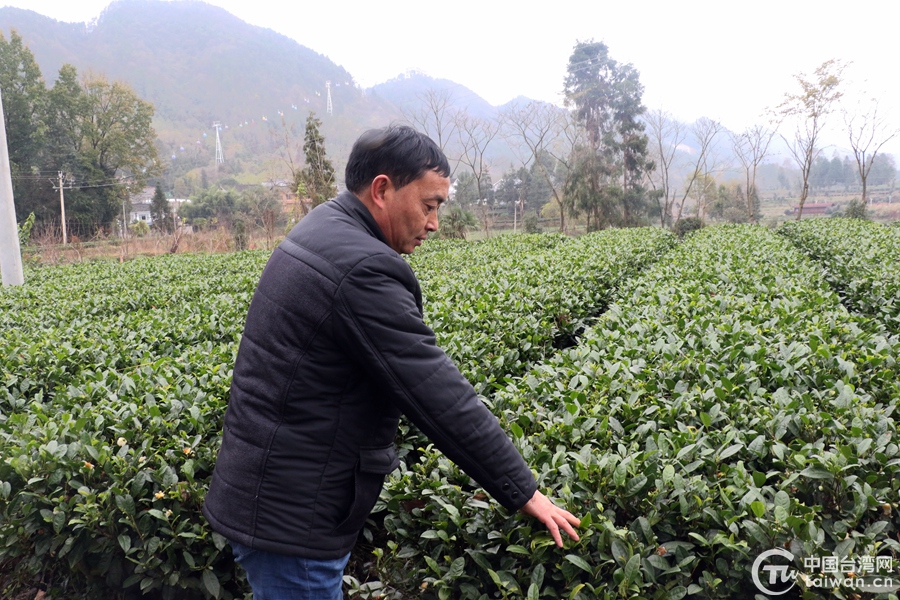 田壩村總支部副書記周朝倫向記者介紹當地種植茶葉的情況。(中國臺灣網 尹賽楠 攝)