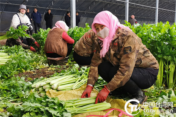 馬虎蘭正在熟練地采摘西芹。(中國臺灣網 李寧 攝)
