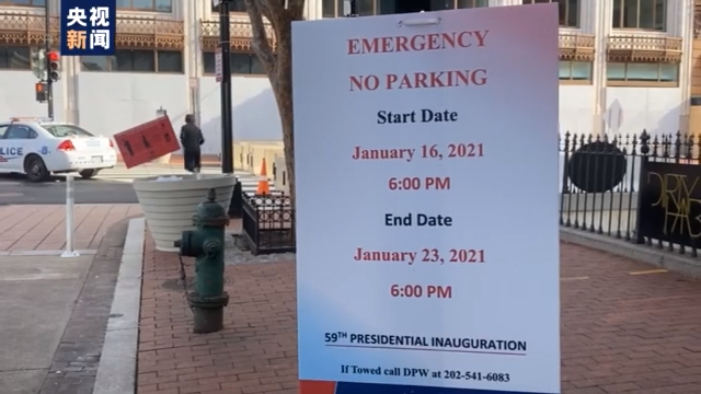 路口張貼的告示顯示,總統就職典禮相關區域的道路從當地時間16日晚開始,一直到23日晚禁止停車,很多路口直接設置了密集的水泥路障。