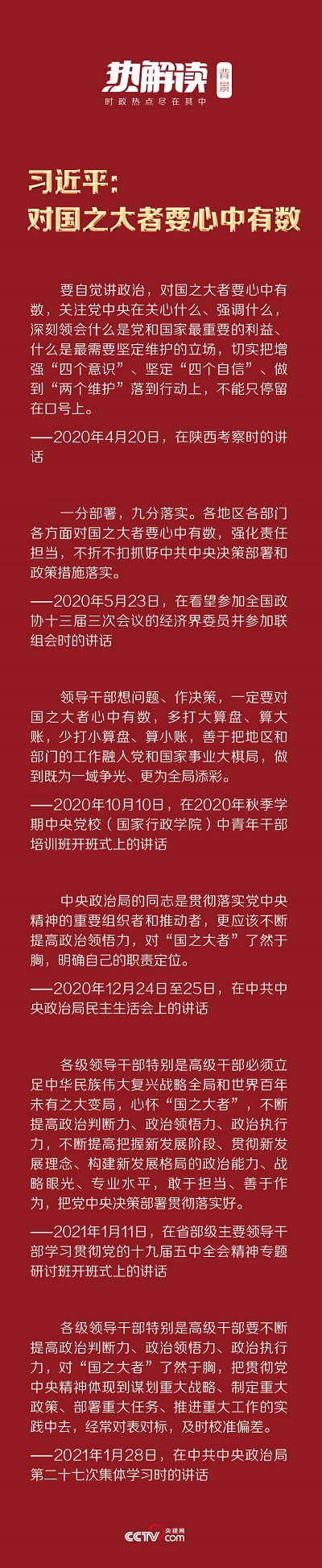 開局之年一個月內(nèi),中共中央政治局常務(wù)委員會會議、中共中央政治局會議、省部級主要領(lǐng)導(dǎo)干部學(xué)習(xí)貫徹黨的十九屆五中全會精神專題研討班等,習(xí)近平總書記已四次提及“國之大者”。