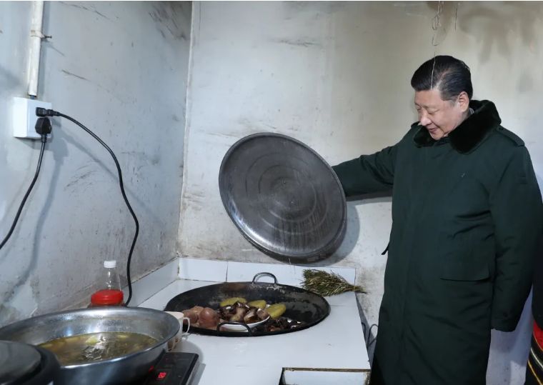 ↑2017年1月24日,習(xí)近平在河北張家口市張北縣小二臺鎮(zhèn)德勝村村民徐學(xué)海家炸年糕。