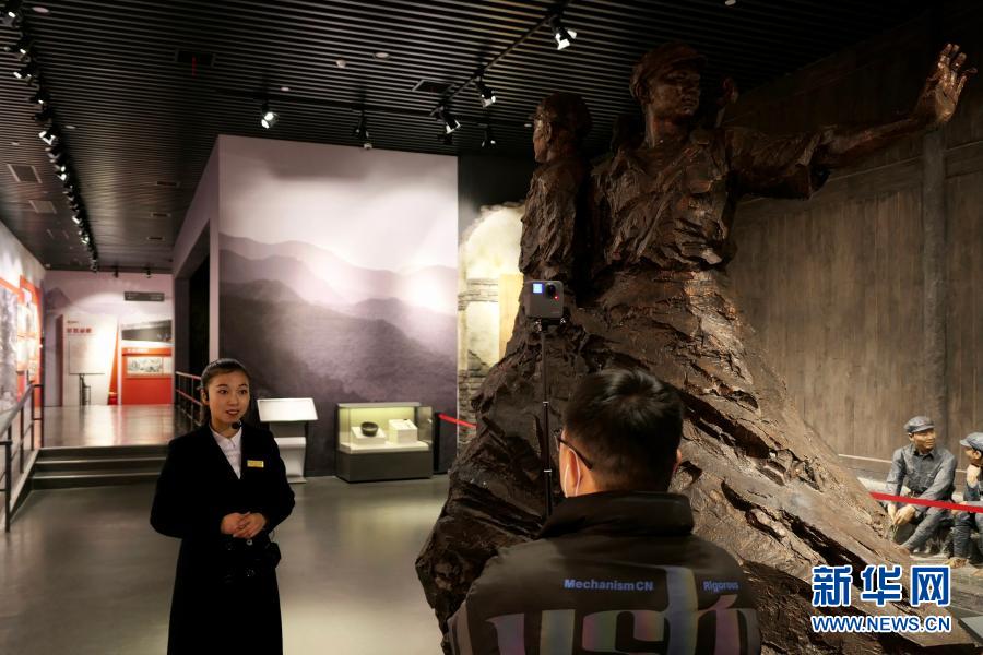 1月26日,在中國工農(nóng)紅軍第二方面軍長征出發(fā)地紀(jì)念館,講解員(左)在介紹一尊雕像,雕像中的三位紅軍都是獨臂,紅二方面軍出了三位“獨臂開國將軍”——賀炳炎、余秋里、晏福生。新華社記者 蘇曉洲 攝