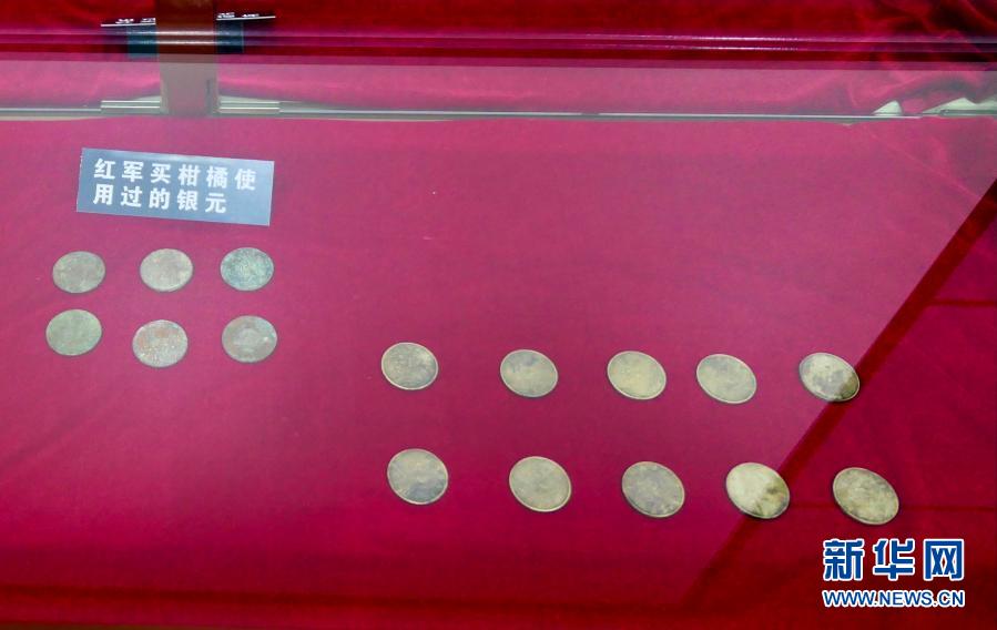 這是1月27日在湖南省張家界湘鄂川黔革命根據(jù)地紀(jì)念館拍攝的銀元,右下角的十枚是當(dāng)年紅軍以高于市價支付給菜農(nóng)的十塊銀元。新華社記者 蘇曉洲 攝