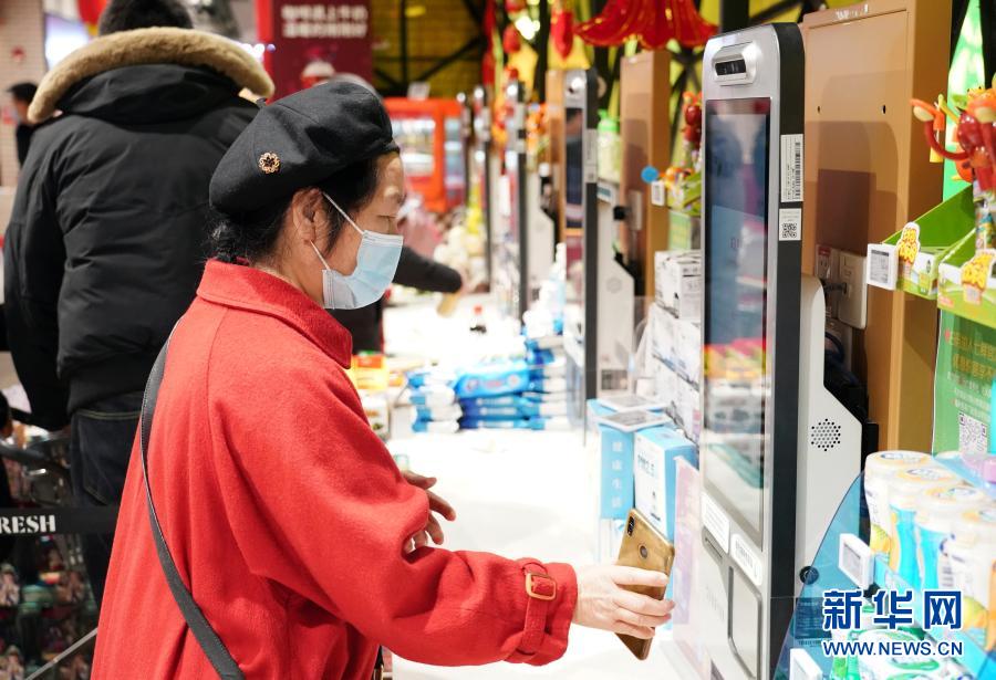 2月15日,在北京市海淀區的七鮮超市北京華宇店,顧客通過自助收銀機結帳。新華社記者 任超 攝