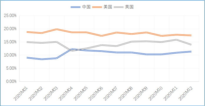 2020年,歐盟與中國實現貿易總額5860.32億歐元,同比增長4.46%,中國在歐盟對外貿易總額中占比達到16.07%,同比上升2.3個百分點,中國成為歐盟最大貿易伙伴。美國和英國在歐盟對外貿易總額中占比分別為15.22%和12.20%,為歐盟第二大和第三大貿易伙伴。中國在疫情最為嚴重的2、3月份降為歐盟第三大貿易伙伴;4月份,隨著中國復工復產復市的推進,以及疫情在全球范圍內的擴散,中國一躍成為歐盟第一大貿易伙伴,并維持至2020年12月。美國則由4月開始降為歐盟第二大貿易伙伴,直至2020年結束。