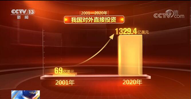 與此同時,對外投資也實現跨越式發展。2001年,我國對外直接投資只有69億美元,而2020年達到了1329.4億美元。對外直接投資年度流量全球排名從加入世貿組織之初的第26位上升至2019年第2位。