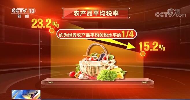 入世以來,中國關稅總水平由2001年的15.3%大幅降至7.5%以下 。其中,工業品平均稅率由14.8%降至7.8% ;農產品平均稅率由23.2%降至15.2% ,約為世界農產品平均關稅水平的1/4,接近發達國家、發達市場對外開放水平。