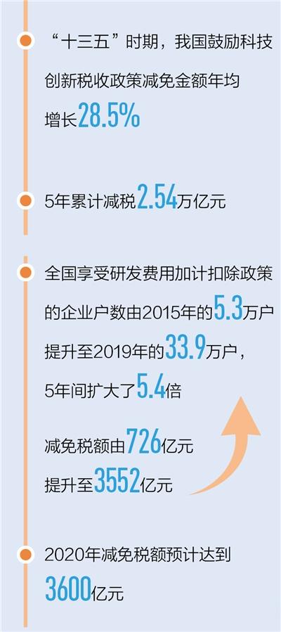 為營造良好的科技創新稅收環境,“十三五”期間,我國逐步推進研發費用加計扣除政策調整優化,推出大幅放寬研發活動和研發費用范圍、分兩步將研發費用的加計扣除比例從50%提升至75%、允許企業委托境外研發費用加計扣除等措施。數據顯示,全國享受研發費用加計扣除政策的企業戶數由2015年的5.3萬戶提升至2019年的33.9萬戶,5年間擴大了5.4倍;減免稅額由726億元提升至3552億元,2020年預計達到3600億元。