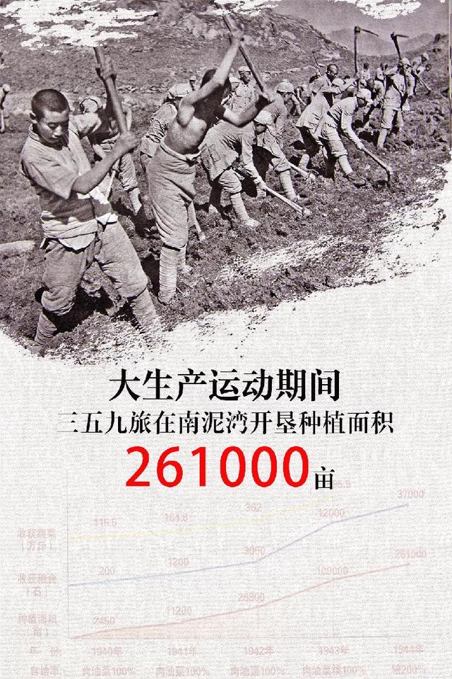 南泥灣大生產展覽館里,一組數字記錄了當年三五九旅創造的農業生產奇跡:1941年,開荒種植1.12萬畝,產糧1200石,蔬菜完全自給。到1943年,開荒達到10萬多畝,產糧12000石,做到了糧食和經費全部自給。