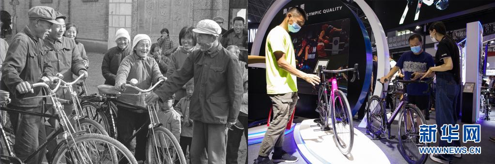 這是一張拼版照片:左圖為1982年,山東省寧津縣杜集公社李鎮(zhèn)大隊社員高高興興地買回新自行車(新華社記者李錦 攝);右圖為2021年5月8日,在海南舉行的首屆中國國際消費品博覽會旅居生活/消費服務(wù)展區(qū),觀眾在體驗時尚運動自行車(新華社記者金立旺 攝)。