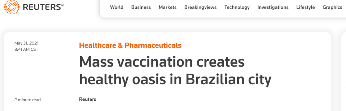塞拉納鎮官員和居民表示,到目前為止,他們感到結果“令人振奮”。與3月的疫情高峰相比,感染率下降了75%。而在完成接種疫苗的人當中,沒有出現死亡病例,這表明科興疫苗對席卷巴西的P.1變異病毒是有效的。