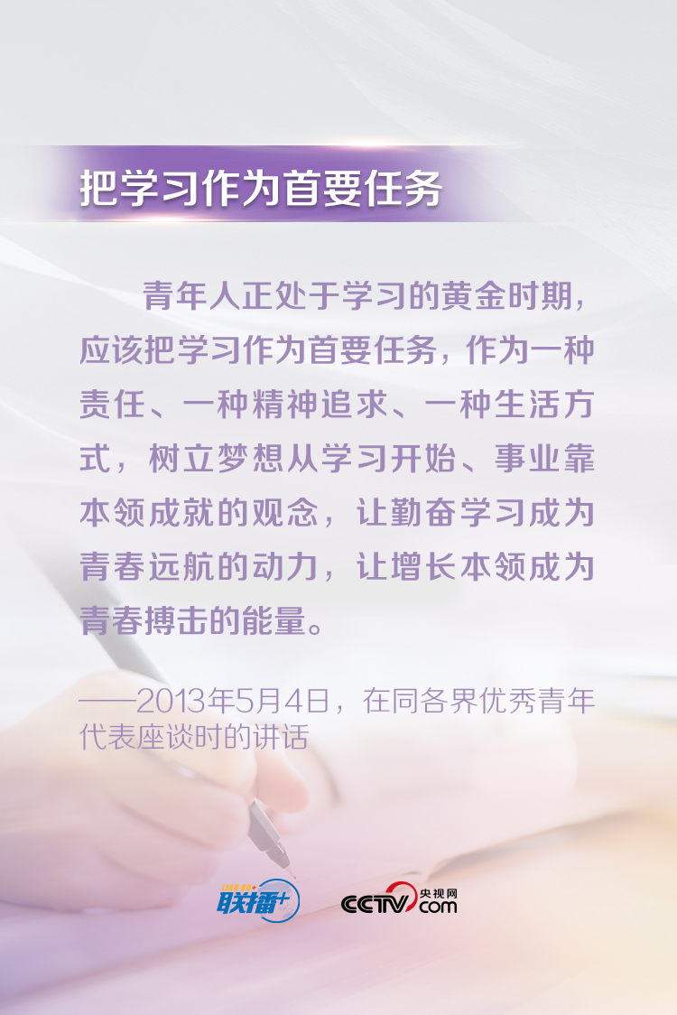 習近平總書記一直以來都十分關心青年成長成才,常常走近青年、傾聽青年、鼓勵青年。他說,“青年最富有朝氣、最富有夢想”,“中華民族偉大復興終將在廣大青年的接力奮斗中變為現實”。央視網《聯播+》特梳理總書記對廣大青年的寄語,與您一起學習。