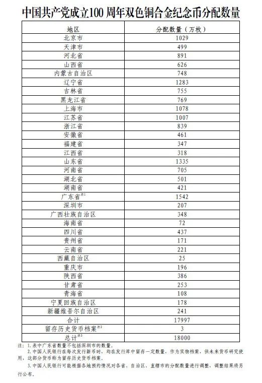 雙色銅合金紀(jì)念幣面額10元,直徑27毫米,材質(zhì)為雙色銅合金,發(fā)行數(shù)量1.8億枚(含留存歷史貨幣檔案3萬枚),各省、自治區(qū)、直轄市雙色銅合金紀(jì)念幣分配數(shù)量如下: