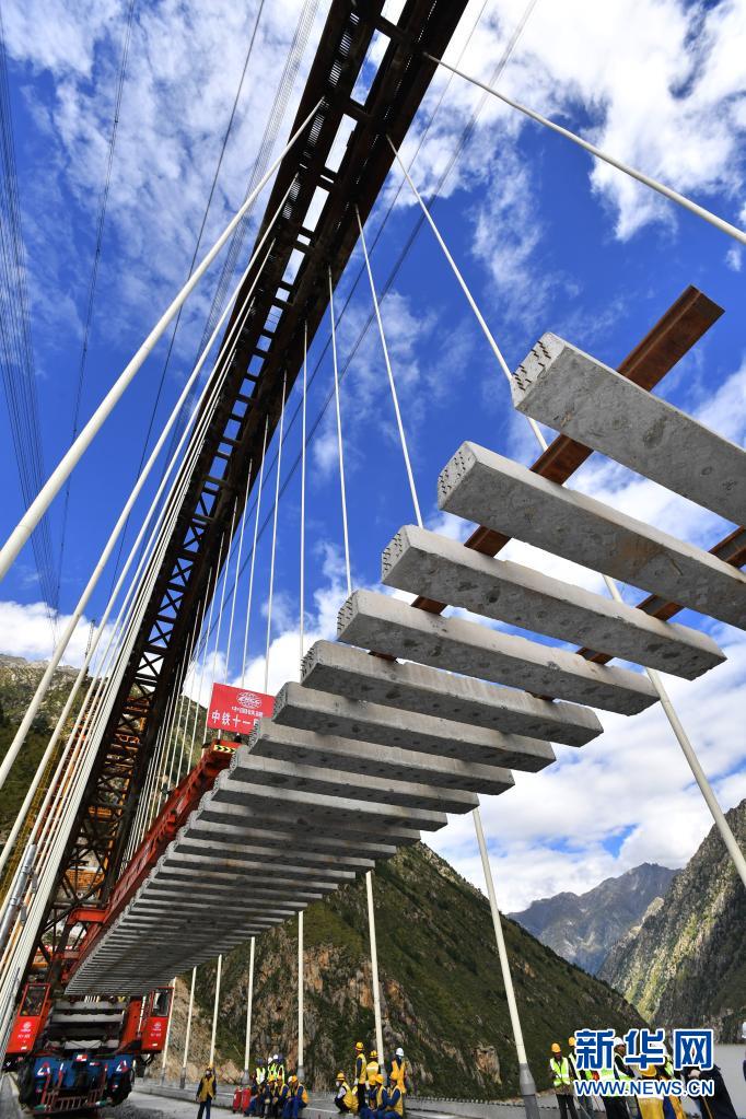 中鐵十一局工程技術人員在拉林鐵路藏木特大橋上鋪軌(2020年9月20日攝)。新華社記者 覺果 攝