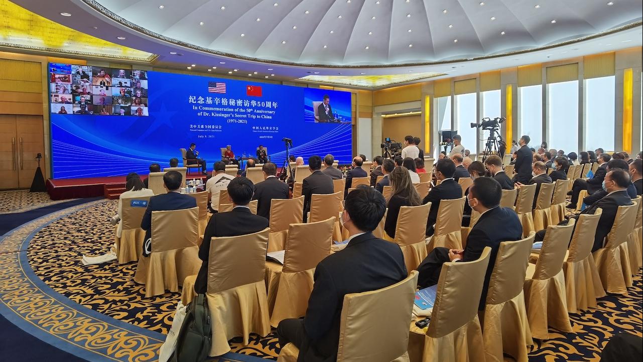 7月9日,紀(jì)念基辛格秘密訪華50周年活動(dòng)在北京舉行,美國前國務(wù)卿基辛格通過視頻連線發(fā)表講話,呼吁中美兩國應(yīng)該像50年前一樣,用對(duì)話和理解來解決分歧,兩國的對(duì)抗只會(huì)導(dǎo)致世界的分裂。中美代表等100余人現(xiàn)場(chǎng)參加活動(dòng),200多位美方各界人士通過視頻連線的方式參加活動(dòng)。