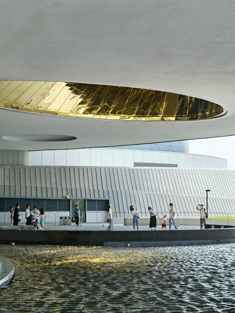 從空中俯瞰,整個天文館像一座表現時間流逝的大型天文儀器。主建筑以優(yōu)美的螺旋形態(tài)構成“天體運行軌道”,獨具特色的圓洞天窗、球幕影院和倒轉穹頂這三個圓形元素構成“三體”結構,共同詮釋天體運行的基本規(guī)律。其中,圓洞天窗位于主建筑的入口,當太陽光穿過圓洞,會在地面形成光斑,隨著太陽在天空中移動,光斑也將在地面上緩緩移動,起到像日晷一樣的作用。