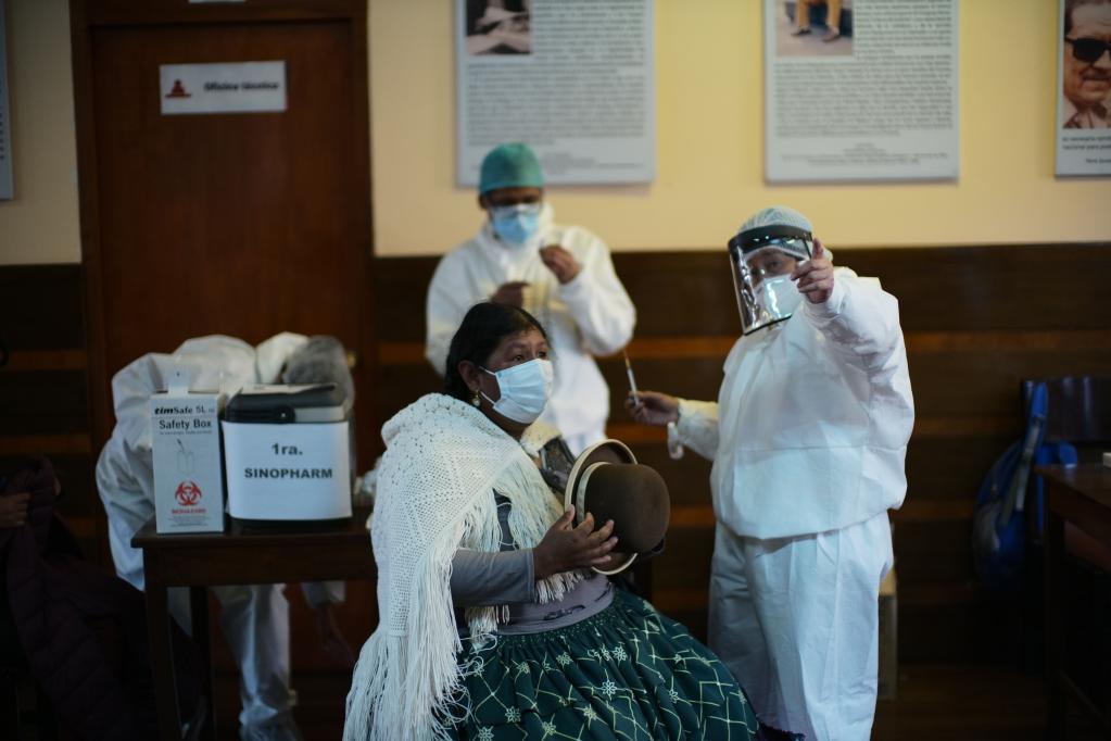 7月5日,在玻利維亞行政首都拉巴斯一處臨時疫苗接種點,一名印第安人接種中國國藥新冠疫苗。新華社記者趙凱攝