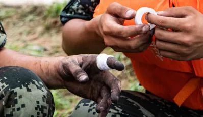 這是一雙抗洪一線武警指戰(zhàn)員的手,泥濘的雙手布滿新舊傷痕。在衛(wèi)生員的一再請求下,他才停下,簡單包扎,又回到大堤上奔忙的隊伍中。