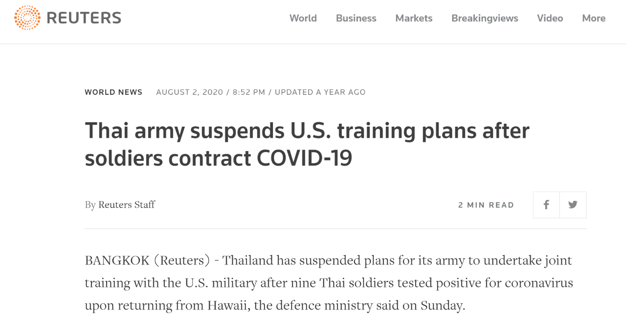 不少國家也開始追溯被美軍傳染的經(jīng)歷。路透社去年8月2日報(bào)道,泰國國防部表示,赴美參加聯(lián)合軍演后,9名從美國夏威夷返回的泰國士兵被確診感染新冠病毒,泰國緊急暫停了泰軍與美軍的聯(lián)合演練計(jì)劃。