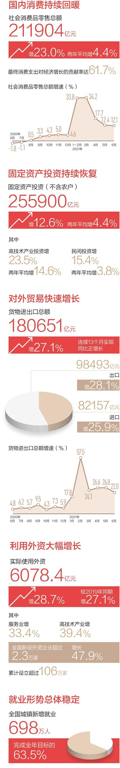 經(jīng)濟(jì)持續(xù)穩(wěn)定增長(zhǎng)。初步核算,上半年國(guó)內(nèi)生產(chǎn)總值同比增長(zhǎng)12.7%,高于6%以上的年度預(yù)期目標(biāo)。其中,二季度同比增長(zhǎng)7.9%,兩年平均增長(zhǎng)5.5%,比一季度加快0.5個(gè)百分點(diǎn)。