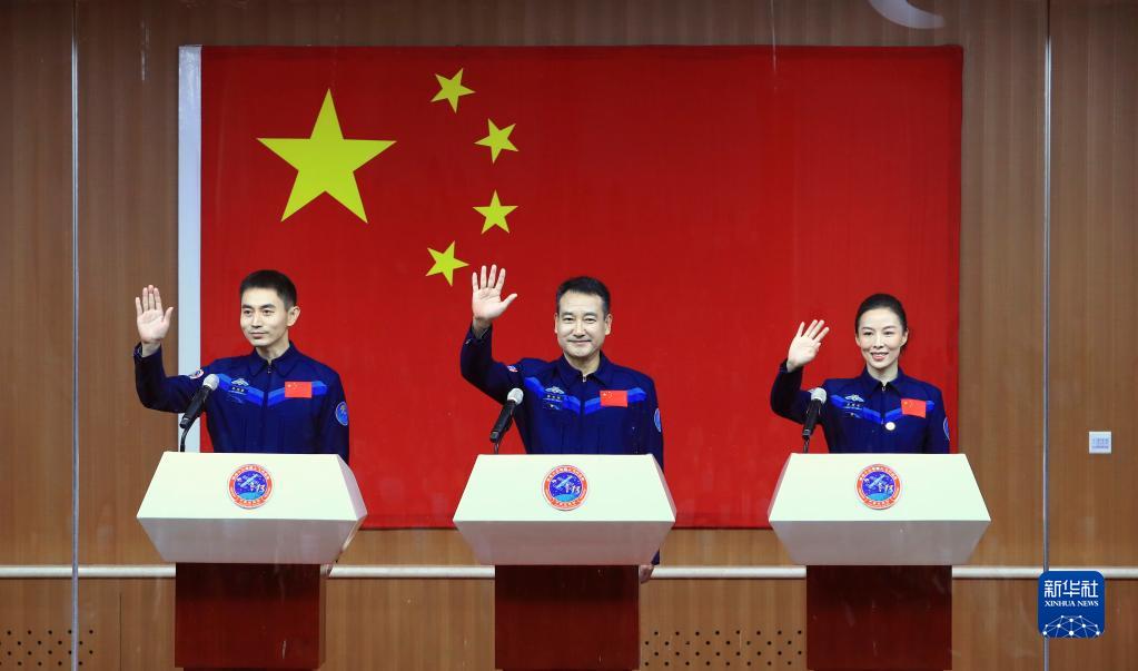 10月14日,執行神舟十三號載人飛行任務的3名乘組航天員翟志剛(中)、王亞平(右)、葉光富在酒泉衛星發射中心問天閣與中外媒體記者集體見面,并回答記者提問。