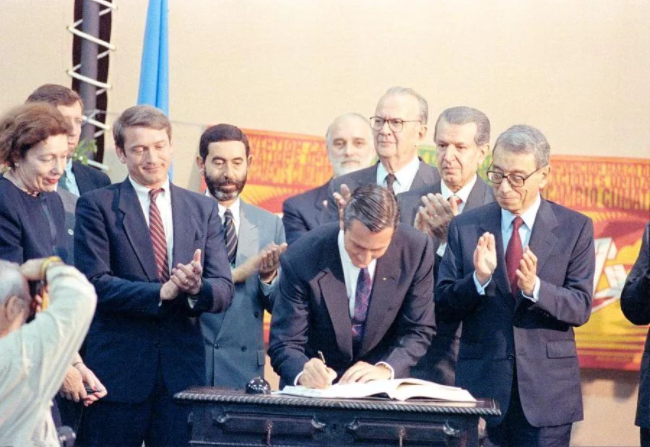 △1992 年里約大會上,各國領導人在時任聯合國秘書長布特羅斯·加利(右)的見證下踴躍簽署《生物多樣性公約》。但美國時任總統老布什沒有簽署。