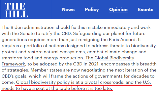 如今30年過去了,這些人的想法仍未有絲毫改變。拜登就任總統后不久,美國右翼智庫就發布了一份報告,呼吁國會參議院在拜登任職期間繼續抵制《生物多樣性公約》等國際條約,理由依然是它們“威脅到美國主權”。